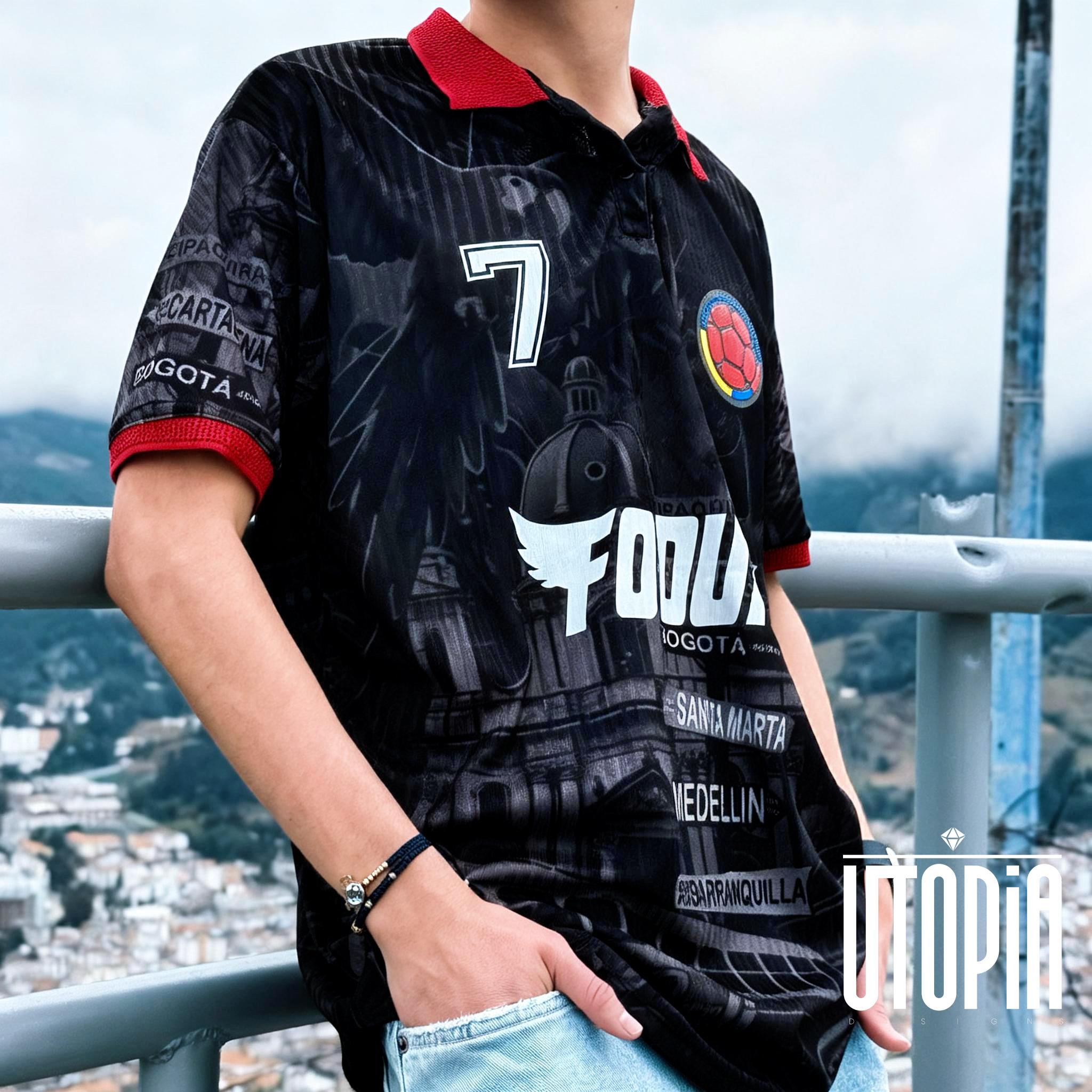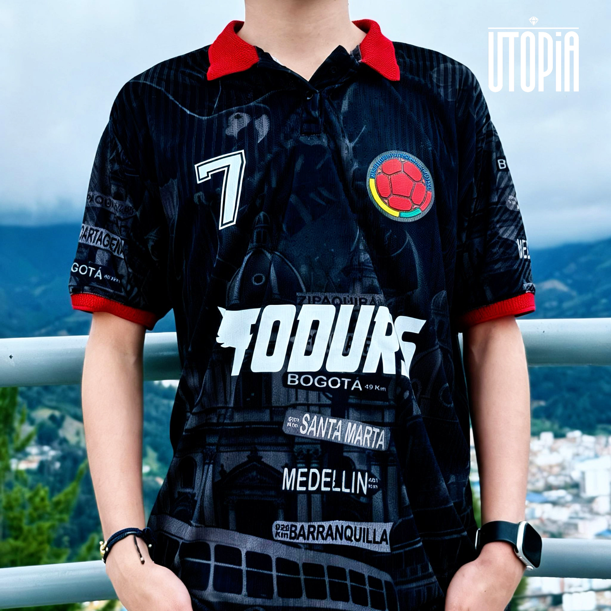 Camisa Colombia Retro Texturizada con Cuello Tejido – Edición 10 Negra