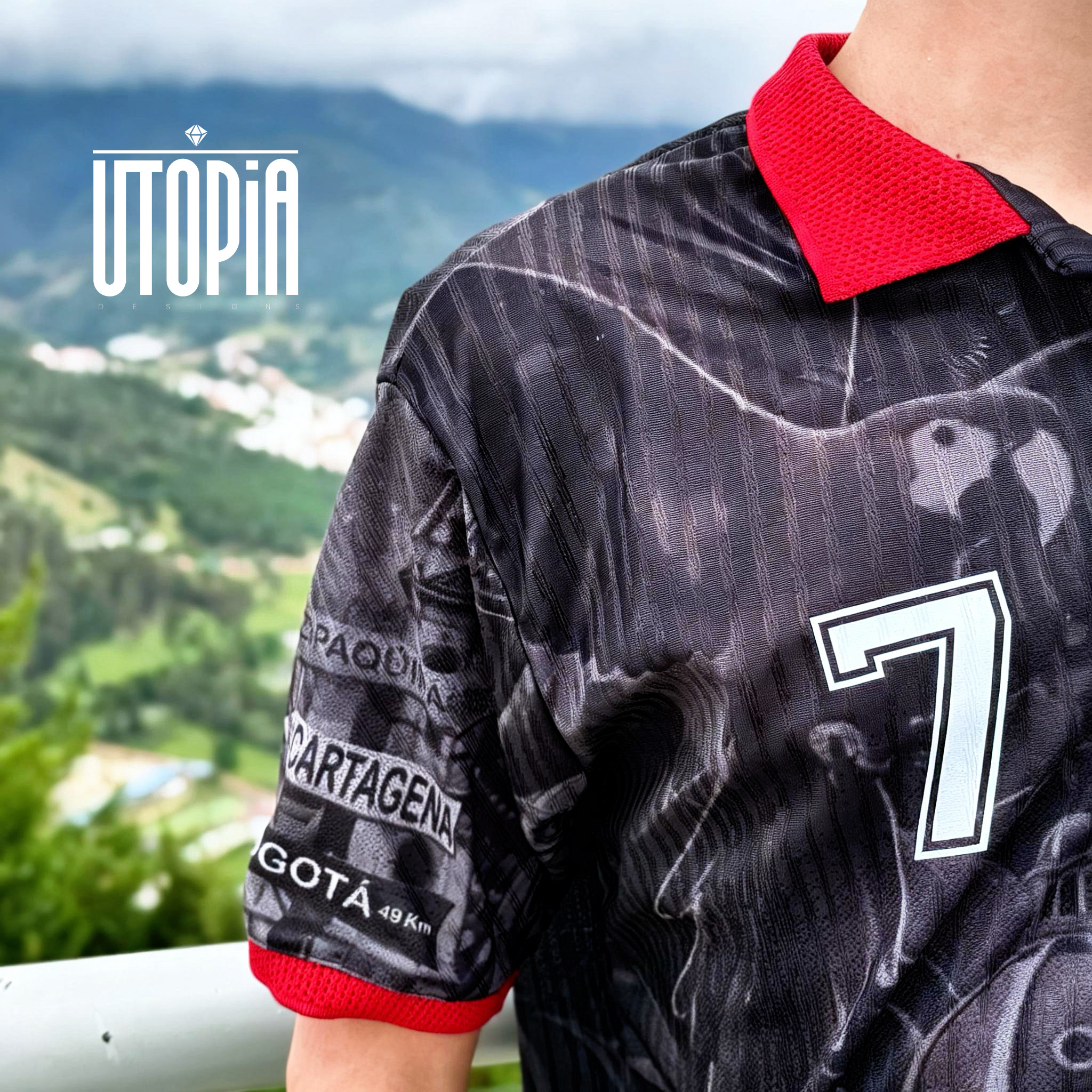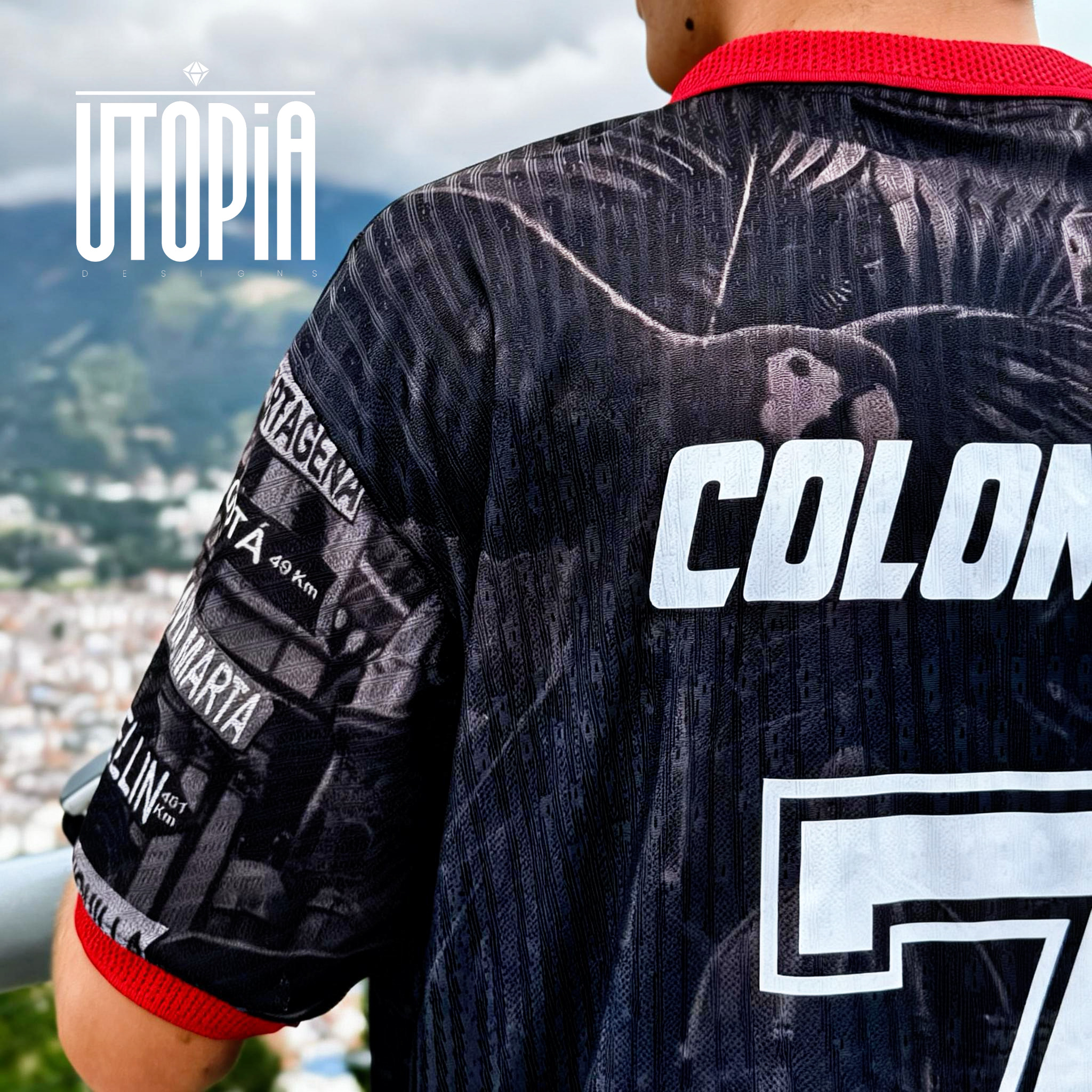 Camisa Colombia retro negra con diseño texturizado, cuello tejido rojo y número 10. Confeccionada con tela de alta calidad y tecnología de control de sudoración, que brinda mayor frescura y comodidad durante su uso.